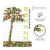 Features the phrase, "Summer Breeze" in trendy font written vertically beside a palm tree with plain white board background; The tree and bottom border are covered with a tropical leaves pattern all over