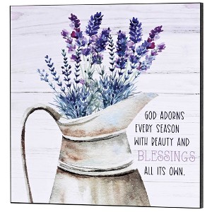 As a thoughtfully designed home décor accessory, this wall art helps you show off your style, while also showcasing a great, faith-filled reminder; Features a beautiful lavender bouquet with sentiment that reads "God Adorns Every Season With Beauty And Blessings All Its Own"; Decorative wall plaque is made of a durable MDF material; Wall art boasts a high-end appearance and rich-looking craftsmanship of which anyone would be proud; Wall sign measures approximately 16 x 16 x .75 inches; Features hanging slot on back for easy display; Perfect atop a shelf, nestled on a mantel, or hanging from your favorite wall; Adding welcoming character to any space in your home; Contained in protective packaging; Ready for easy gifting for a birthday, holiday, Christmas, Mother's Day or other celebration