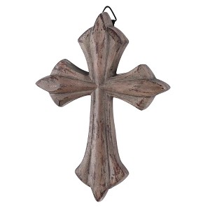 Wall cross has a brown wash look with a raised/rounded front and beveled edges; D-hanger on back