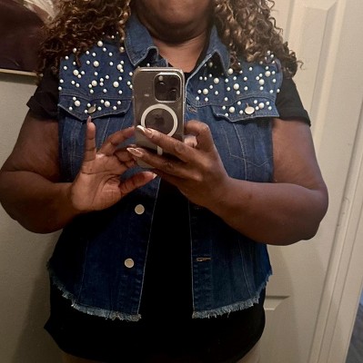 Unique Embellishments: Showcases distressed details and intricate pearl embroidery, adding a touch of luxury to a classic denim vest