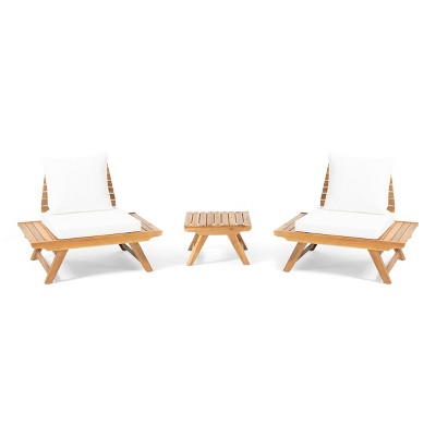 Create a cozy corner for your patio or deck space that also offers impeccable style to your décor. Featuring a wide seat panel and legs that angle outwards, our club chair and table set will be a flawless addition to any backyard or patio. This set features a wing-like structure offers extra space on either side of the seat cushion for a unique design. With solid acacia wood frames and plush outdoor cushions, this set offers hours of conversation for you and your guests.