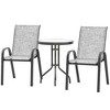 Brighten your outdoor space with the Outsunny patio bistro set, a charming cafe or chic lounge addition for small spaces. This balcony furniture set has two stackable armchairs and a round glass-top table. Powder-coated steel frames offer a strong outdoor patio set. Featuring a breathable mesh seat, sloping high back, and supportive curved armrests, this outside furniture set is a stunning and cozy corner for friend hangouts, daily talk, and sunset viewing.