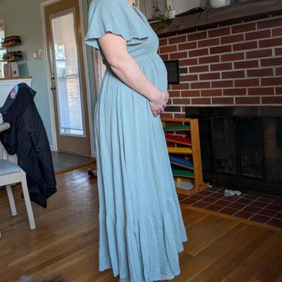 This dress looked really stunning and was very comfortable on a pregnant body. It has tons of stretch to grow with you through all nine months of pregnancy and actually could even be worn by someone who’s not pregnant because it’s not stretched out to begin with! The color of sage is really pretty . This is a small on my daughter who is about 52 so I think it was a true to size, it’s meant to be a maxi dress.