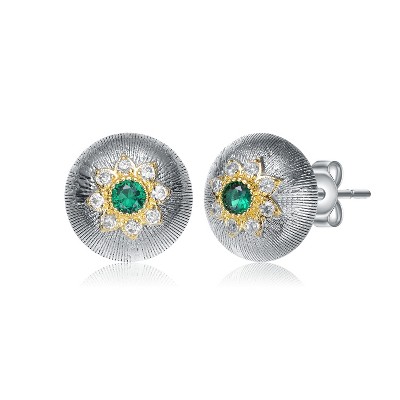 Elegant rhodium and 14K gold plated stud earrings featuring emerald-colored cubic zirconia
