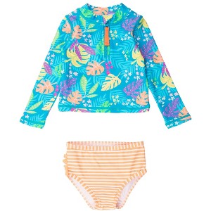 Rufflebutts Baby/toddler Girls Upf50+ Long Sleeve Zipper Rash Guard 2-piece - Neon Tiki Vibes, 3-6m