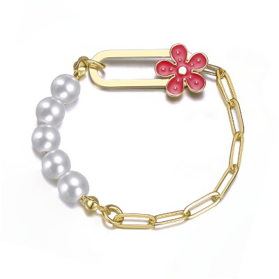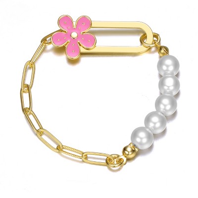 This charming 5.25-inch children's bracelet elegantly blends classic and whimsical elements. Featuring 3/4 segments of 14k gold-plated links that transition into radiant white round pearls, this piece is as sophisticated as it is adorable. It secures with an enchanting enamel flower clasp that fits seamlessly through the bar, ensuring both style and security. The flower clasp is available in blue enamel and also in a pink enamel option. Perfect for young fashionistas, this bracelet adds a touch of elegance and playfulness to any outfit, making it a wonderful gift for special occasions.