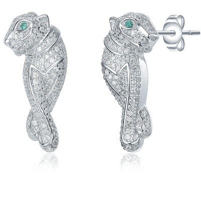 Luxurious 14k gold plated earrings featuring a panther design adorned with emerald and sparkling cubic zirconia for a bold and elegant statement