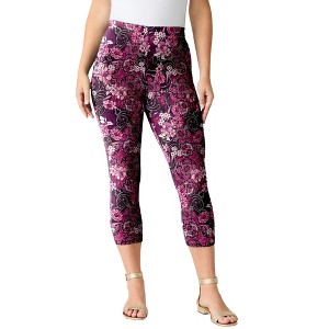 Roaman's Petite Plus Size Essential Stretch Capri Legging - 42/44, Dark Berry Rose Paisley