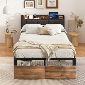 Lusimo Queen Upholstered Strong Wood Slats Support Bed Frame with 2 Storage Drawers and Charging Station