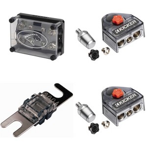 This bundle features premium Kicker accessories essential for your car audio setup. The Kicker 50BT4S Warhorse Battery Terminal with Side Post Inserts offers 4 outputs and is constructed with nickel-plated brass, providing durability and reliability. Its injection-molded covers with beveled corners ensure a secure fit, making it multi-amp configuration-ready for versatile use.The Kicker 50HPFD2 Warhorse 2-Output Fused Distribution Block, also made of nickel-plated brass, includes jumpers for easy ground distribution. With injection-molded covers and multi-amp compatibility, this block simplifies power distribution and organization in your system setup.For protection, the bundle includes the Kicker 46AFS200 200 Amp AFS Fuse, offered in a package of 2. These platinum-plated fuses guarantee maximum current transfer, safeguarding your amplifiers effectively. The 200-amp rating ensures ample power delivery while ensuring your system remains secure from electrical surges.Enhance your car audio experience with the convenience and efficiency of these high-quality Kicker components. Ideal for sound system enthusiasts seeking reliable power distribution and protection, this bundle covers essential aspects of optimizing your vehicle's audio setup. Ensure your amplifiers are safeguarded while receiving the necessary power output with this comprehensive Kicker accessory package.