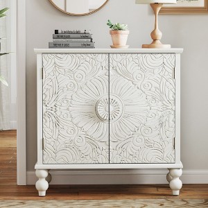 Buffet Accent Cabinet with Storage, Distressed Storage Cabinet with 2 Carved Doors and Adjustable Shelf, Wooden Accent Sideboard Buffet Cabinet, White