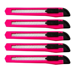FEATURES: FIVE (5): Small Neon Pink Utility Knife Box Cutters. 5.25 inch Long. 50 inch Usable Blade. Retractable Blade. One Hand Thump Slide and Lock. .50 inch Wide Snap Off Blade. 12 Snap off Segments for New Tip. Black Knife End used to Snap Blade. Blade is Replaceable. NOTE: Each order is for FIVE (5) knives:
