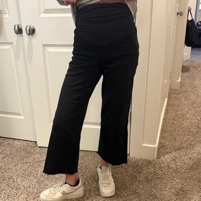 I love love love these jeans! I am loving the new wide leg raw hem jeans look, so I had to get these. I wasn’t prepared for how comfortable they wiuos be! I got my normal pre-maternity size 26 and these fit true to size. The waist is super stretchy and comfortable. It is full belly coverage. The color is great, it’s like a faded black and so easy to pair with pretty much anything. I gotta get more of these!