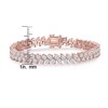Mark a memorable moment with elegance and romance by gifting this exquisite tennis bracelet. Designed to impress, it features sparkling round brilliant cut cubic zirconias arranged in delicate clusters of two, symbolizing love and togetherness. Crafted from sterling silver and beautifully plated in warm 18k rose gold, this bracelet radiates sophistication and charm. A hidden box/slide clasp with dual figure-eight safety latches ensures a secure and comfortable fit, making it a perfect accessory for both everyday wear and special occasions. A timeless piece that speaks from the heart.