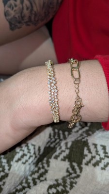 Add a graceful touch of sparkle to your ensemble with this dazzling bangle bracelet, crafted from brightly polished sterling silver and finished in rich 14k gold plating. Two shimmering rows of cubic zirconias elegantly line the top of the bangle, evoking the delicate beauty of drizzling rain. The sleek, refined silhouette makes it a versatile piece that complements both casual and formal looks. A hidden clasp with a secure snap closure ensures it stays comfortably in place, combining beauty with everyday practicality.