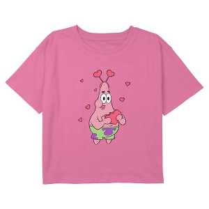 Let your kid shine bright in this eye-catching girls' boxy cropped t-shirt that is perfect for Valentine's Day! Featuring the playful Patrick Star dressed for the holidays wearing a heart bopper as he munches on a heart-shaped candy.