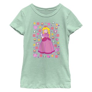 Girl's Nintendo Princess Peach Cute Icons T-Shirt - Mint - Large