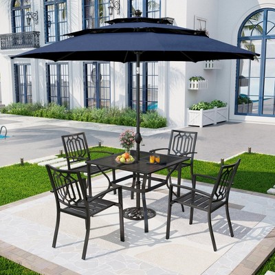 Captiva Designs 6pc Outdoor Patio Square Steel Dining Table with Stackable Metal Chairs and Blue Umbrella