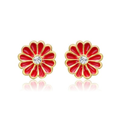 - Charming Flower Design – These 14K gold-plated flower stud earrings feature rich red enamel petals and a sparkling round brilliant-cut cubic zirconia at the center, symbolizing joy, happiness, and love.