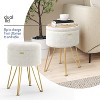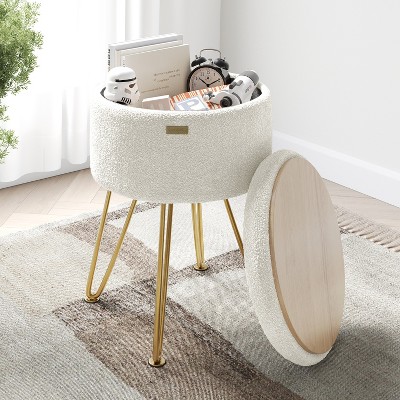 This round storage ottoman stool is 17" H x 13" D and supports up to 330 lbs, with solid construction and sturdy legs in gold.