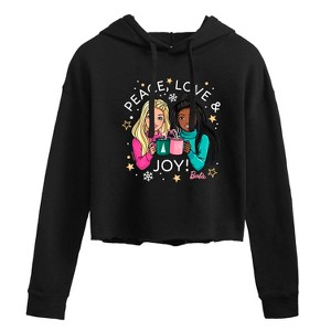 Barbie - Holidays & Christmas - Peace Love & Joy - Juniors Cropped Pullover Hoodie - Step into the glamorous pink world of Barbie with our officially licensed graphic garments for the fashion-forward! Whether you dream of being a fashion designer, a mermaid princess, or a world-traveling explorer, our garments bring Barbie's world to life with vibrant colors and playful prints. Crafted with quality materials and attention to detail, each piece ensures comfort and durability for all-day play. Express your unique sense of style and imagination with our exclusive Barbie graphic apparel!