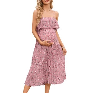 YESFASHION Maternity Dress Womens Spaghetti Strap Floral Maxi Dress Ruffled High Waisted Backless Pleated Dress for Baby Shower Floral 1Pink M