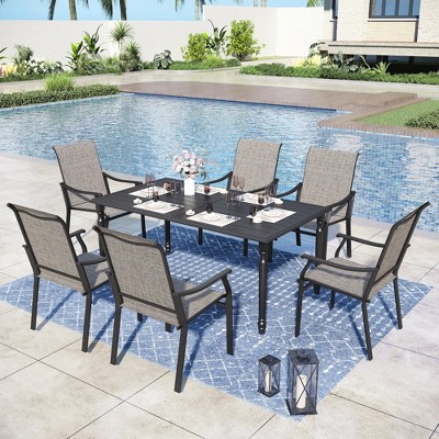 Captiva Designs 7pc Patio Outdoor Dining Round Slatted Rectangle Steel Table with Umbrella Hole & Brown Textilene Fixed Chairs