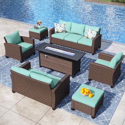 Captiva Designs 7pc Outdoor Patio Wicker Rattan Cushioned Sofa Fire Pit Set with Ottomans and Loveseat Beige