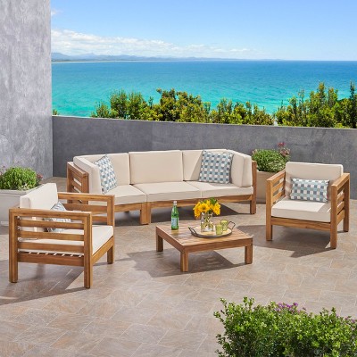 Christopher Knight Home Kaena Outdoor Acacia Wood 5 Seater Sofa and Club Chair Chat Set with Cushions, Beige/Teak