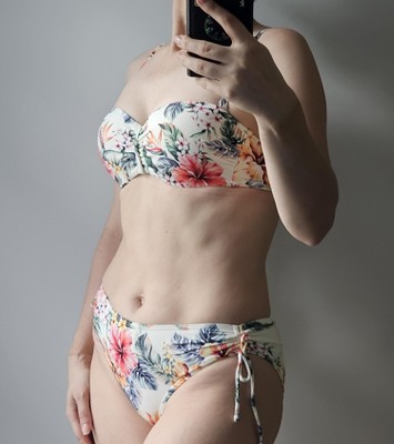 Women's Tropical Print Bandeau Bikini Swimsuit Top Bra Sizing - LASCANA - Ivory Printed Floral 32B