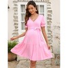 Women's Maternity V Neck Short Puff Sleeves Dresses Pregnancy Casual Tie High Waist A Line Solid Color Midi Dress Pink Small