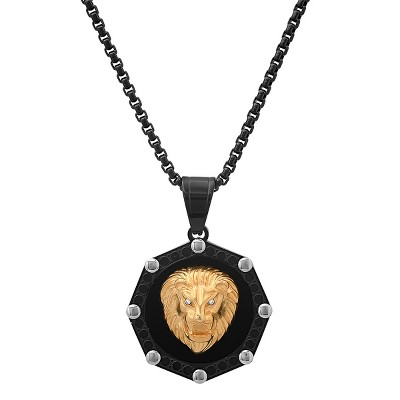 Men's tri toned black ip, 18k gold plated and stainless steel octagon lion head pendant with simulated diamonds. Thoughtfully designed for everyday wear and special moments, with a balanced profile that pairs easily with casual layers or evening looks. Each piece is produced with attention to proportion and comfort, emphasizing clean lines and subtle texture so it feels considered without being fussy. Wear it solo as a quiet statement or stack it with favorites to build a look that reflects your mood. Great as a gift or a personal update to your rotation; store in a soft pouch when not in use to help preserve the finish.