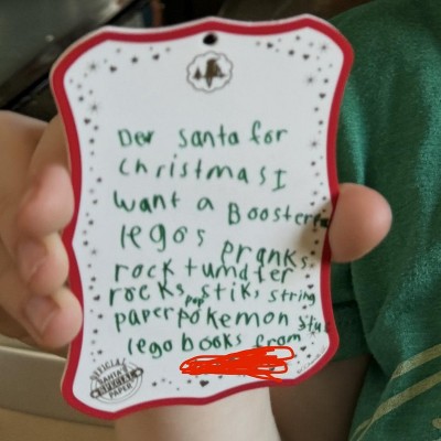 The book is whatever, my kid couldn’t care less. But we’ve been doing these letters for years and they are my favorite keepsake. Precious and priceless to have his list hang on the tree each year. I put the year and his age on the back and will treasure them forever.
