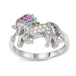 Sterling Silver Children's Cubic Zirconia Unicorn Ring Delight your little one with the Sterling Silver Children's Cubic Zirconia Unicorn Ring, a whimsical and enchanting piece that brings magic and sparkle to their jewelry collection. Designed with a playful unicorn motif, this ring features brilliant cubic zirconia stones in a rainbow of colors, making it a fun and dazzling accessory. Charming Unicorn Design This adorable ring showcases a beautifully detailed unicorn, its majestic form brought to life with sparkling cubic zirconia stones. The flowing mane and tail are decorated with multicolored gemstones, creating a vibrant and lively look. The unicorn's elegant posture adds an extra touch of fantasy, making it a must-have for unicorn lovers. Dazzling Cubic Zirconia Accents The unicorn's mane and tail feature an array of multicolored cubic zirconia stones, including shades of pink, blue, yellow, and purple, to create a rainbow-like shimmer. The body is encrusted with white cubic zirconia, enhancing its radiant sparkle. Each gemstone is carefully set to maximize brilliance and capture light from every angle. Premium Sterling Silver Construction Crafted from genuine sterling silver, this ring offers a durable and hypoallergenic finish, perfect for sensitive skin. The high-polish shine enhances the overall sparkle, ensuring that it remains beautiful for years to come. Metal: Sterling Silver Finish: High Polish Gemstones: Multicolored Cubic Zirconia Hypoallergenic: Safe for children’s sensitive skin Perfect Gift for Any Occasion This Sterling Silver Children's Cubic Zirconia Unicorn Ring is the ideal gift for birthdays, holidays, or any special occasion. Whether it's a gift for a young unicorn enthusiast or a charming keepsake, this magical ring is sure to be cherished. Key Features: ✔ Adorable unicorn design with multicolored cubic zirconia ✔ Sterling silver band for durability and comfort ✔ Hypoallergenic and tarnish-resistant for everyday wear ✔ Perfect gift for birthdays, holidays, or unicorn lovers This Sterling Silver Unicorn Ring is a whimsical and enchanting addition to any child's jewelry collection, bringing joy and sparkle to their everyday adventures.