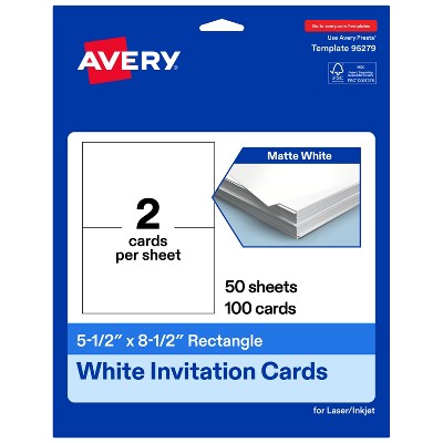 Easily create your own postcards, index cards, thank you cards, holiday cards, menu cards, RSVP cards, promotional pieces, and more with Avery Matte White Rectangle Cards. Created with heavyweight and durable 80lb / 216 gsm cardstock, the smooth matte material is a versatile fit for any project or event. Printable on both sides and compatible with laser and inkjet printers, the matte white cards let you create professional designs with a desktop printer. The print-to-the-edge layout lets you print all the way to the edge of the card. Printable on both sides, these cards make it easy to show different information on the front and back. For best results, use the card setting on your printer and feed one sheet at a time.