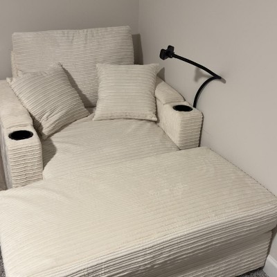 The chair is very comfortable and looks nice overall. However, the storage on the left armrest is broken—the wood inside seems damaged, so the hinges can’t attach properly. Also, the ottoman is slightly wider than the chair, so it doesn’t align perfectly. Despite these issues, it’s still a comfy piece.