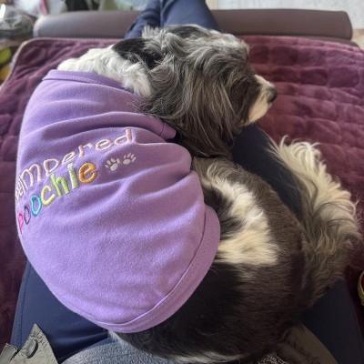 • Luxurious yet playful embroidered slogan: This stylish purple tee showcases the charming “Pampered Poochie” embroidery, adding a touch of sophistication and attitude to your pet’s look