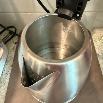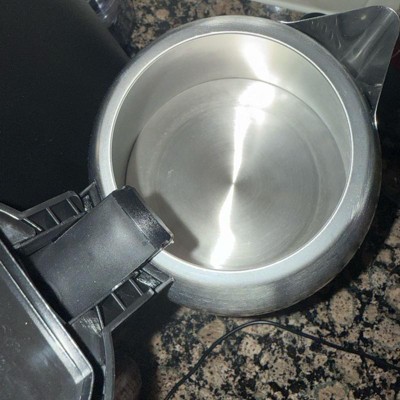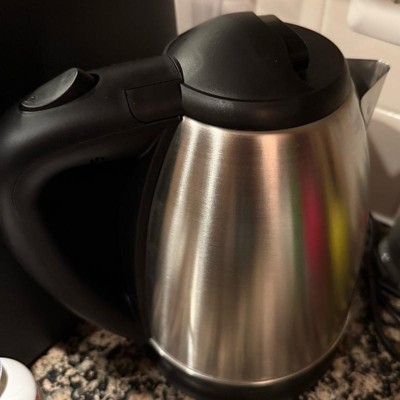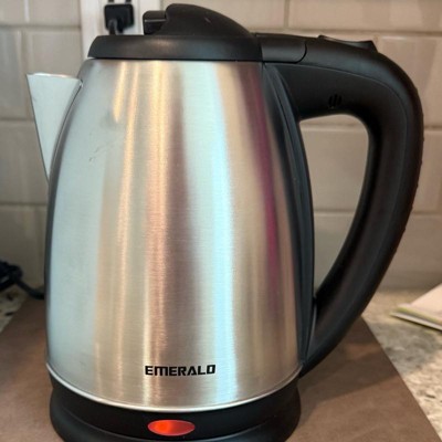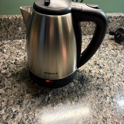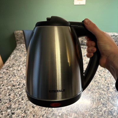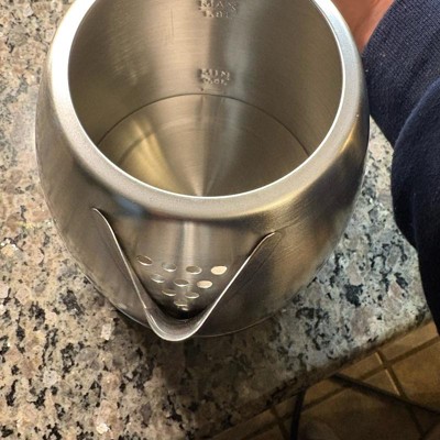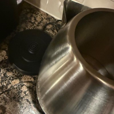 This stainless electric teakettle with base is really nice! It has a red light that lets you know when the water is ready. The handle stays cool so it’s easy to pour from. The off/on button is also on the top of the handle so it’s very convenient to reach. It will automatically turn off also. The water goes through several little holes so it doesn’t come rushing out suddenly. It holds almost 2 liters so plenty for several cups of tea. I received an incentive to write this review.