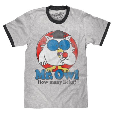 Your New Favorite Mr Owl Shirt: Show your love for Tootsie Roll Pops with the classic Mr. Owl icon and "How Many Licks" phrase - distressed and printed on the softest grey heather ringer t-shirt we could find.