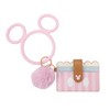 Add a touch of whimsy to your accessories with this pink Disney Mickey Mouse card wallet. The wallet showcases Mickey with sprinkles on the front and a playful pink striped Mickey shorts design on the back. It features a snap closure for secure storage and is adorned with a Mickey head rubber wristlet and a pink faux fur pom pom. Made with durable PU and rubber materials, this wallet measures 10 CM W x 7.5 CM H. For effortless care, simply wipe it clean to maintain its charm.