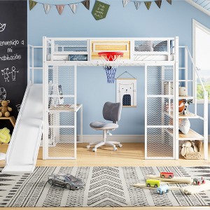 Full Size Metal Loft Bed with Built-in Desk, Open Wardrobe, Basketball Hoop, Slide and Staircase, White - ModernLuxe