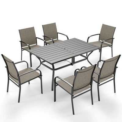 Captiva Designs 7pc Patio Dining Slat-top Rectangle Table & Textilene Chairs with Wood-like Armrests