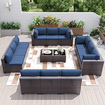 ALAULM 14 Pieces Patio Furniture Set, Rattan Wicker Outdoor Conversation Sets, Furniture Sectional Sofa Set w/4"Cushion and Glass Coffee Table(Grey)
