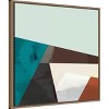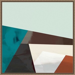 This image is a digital art piece featuring a modern, abstract composition with intersecting geometric shapes. The design includes large triangles in a palette of teal, brown, white, and rust colors, creating a dynamic and visually engaging artwork with a minimalistic aesthetic. The shapes overlap and create a sense of depth and movement on a light background. This canvas art print was created by Sisa Jasper and printed in Waunakee, WI. It is stretched across a solid surface to resist sagging. We use only premium, high-tension canvas. Our exclusive stretching techniques hide corner folds and provide a taut canvas surface. The artwork is authentically licensed. The canvas appears as if it is floating in the frame because it has a narrow gap between the edge of the canvas and the frame. Our canvas items are individually made using traditional custom framing techniques, it has the quality you would expect from your local frame shop.