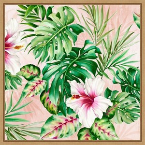 The artwork features lush green monstera leaves intertwined with vibrant hibiscus flowers against a soft pink background. The composition creates a tropical and exotic atmosphere. The pink hues of the flowers contrast beautifully with the rich green foliage. This canvas art print was created by Alex Black and printed in Waunakee, WI. It is stretched across a solid surface to resist sagging. We use only premium, high-tension canvas. Our exclusive stretching techniques hide corner folds and provide a taut canvas surface. The artwork is authentically licensed. The canvas appears as if it is floating in the frame because it has a narrow gap between the edge of the canvas and the frame. Our canvas items are individually made using traditional custom framing techniques, it has the quality you would expect from your local frame shop.