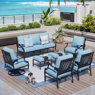 Captiva Designs 6pc Metal Patio Outdoor Conversation Set with Rocking Grid-back Chairs, Ottomans and Coffee Table Sky Blue