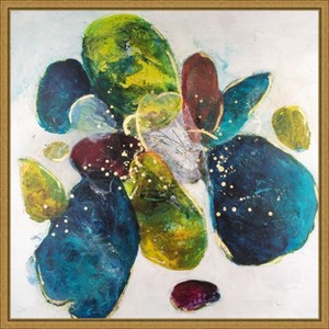 The artwork features a dynamic composition of large, organic shapes in rich blues, greens, and reds against a light background. These shapes are textured with splashes and dots of contrasting colors, creating a sense of movement. The abstract nature of the painting evokes a lively and energetic atmosphere. This canvas art print was created by Joyce Combs and printed in Waunakee, WI. It is stretched across a solid surface to resist sagging. We use only premium, high-tension canvas. Our exclusive stretching techniques hide corner folds and provide a taut canvas surface. The artwork is authentically licensed. The canvas appears as if it is floating in the frame because it has a narrow gap between the edge of the canvas and the frame. Our canvas items are individually made using traditional custom framing techniques, it has the quality you would expect from your local frame shop.