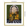 The artwork features a majestic peacock with its vibrant tail draped over an ornate yellow sofa. Above the peacock hangs a grand crystal chandelier, set against a large arched window showcasing a serene landscape. The room's walls are adorned with intricate green patterns, complementing the checkerboard floor. This framed art print was created by Erika C. Brothers and printed by Amanti Art in Madison WI. The print is giclee printed using fade-resistant inks for picture-perfect detail and incredible depth of color and finished with a 100% real wood frame. Individually made using traditional custom framing techniques, it has the quality you would expect from your local frame shop.