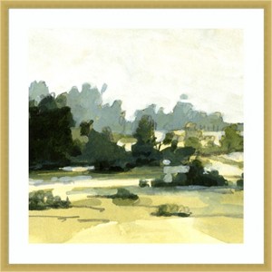 The artwork features a serene landscape painted in watercolor, with an abstract approach to depicting nature. Various shades of green form lush trees against a light, soft sky, evoking a tranquil atmosphere. The scene conveys a peaceful, pastoral setting. This framed art print was created by Emma Caroline and printed by Amanti Art in Madison WI. The print is giclee printed using fade-resistant inks for picture-perfect detail and incredible depth of color and finished with a 100% real wood frame. Individually made using traditional custom framing techniques, it has the quality you would expect from your local frame shop.