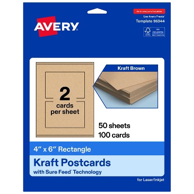 Easily create and print your own cards with Avery Kraft Brown 4" x 6" Rectangle Cards. Infuse postcards for mailing, recipe cards, thank you cards for weddings, and more with a touch of rustic charm, using Avery kraft brown cardstock. Created with heavyweight and durable 80 lb / 216 gsm kraft brown cardstock, the kraft brown material is a versatile fit for any project or event. Printable on both sides and compatible with laser and inkjet printers, the cards let you create professional designs with a desktop printer. Avery rectangle cards are carefully constructed with useful features to provide the best results. Sure Feed technology reduces jams or smudges by creating a more reliable feed through your printer.